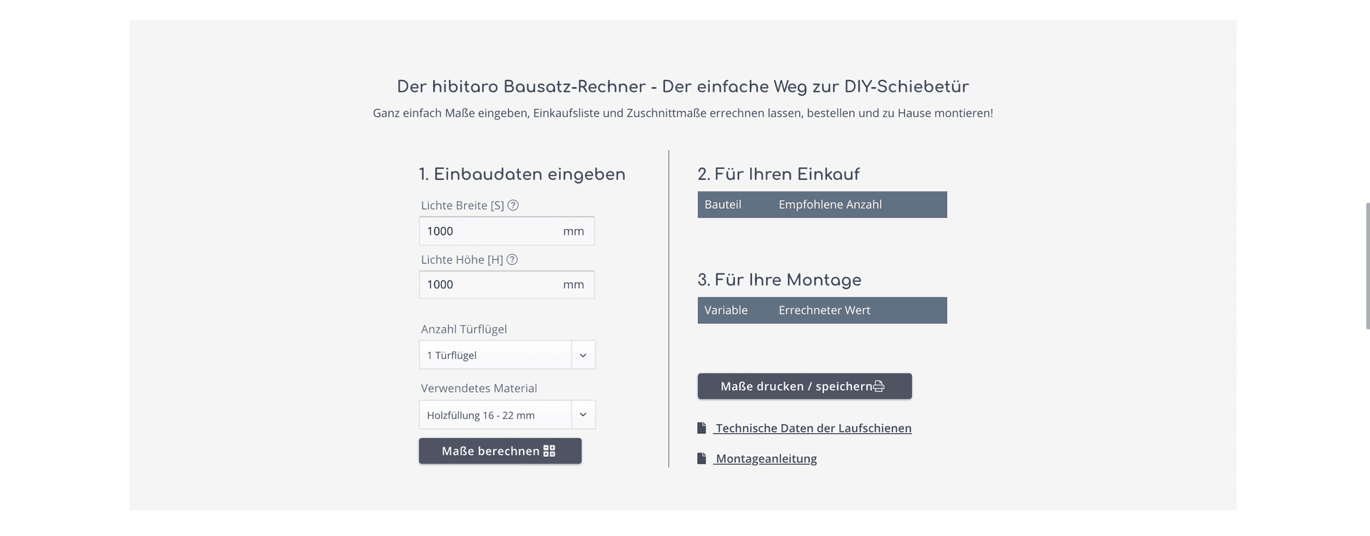Auf jeder Bausatz-Artikelseite finden Sie unterhalb des Bereiches mit der Zusammenfassung (Bilder, Kurzinfos, Preise, etc.) und dem passenden Zubehör unseren Bausatz-Rechner. Dieser ist für jeden Schiebetür-Bausatz entsprechend der jeweiligen Montageanleitung anpeasst.