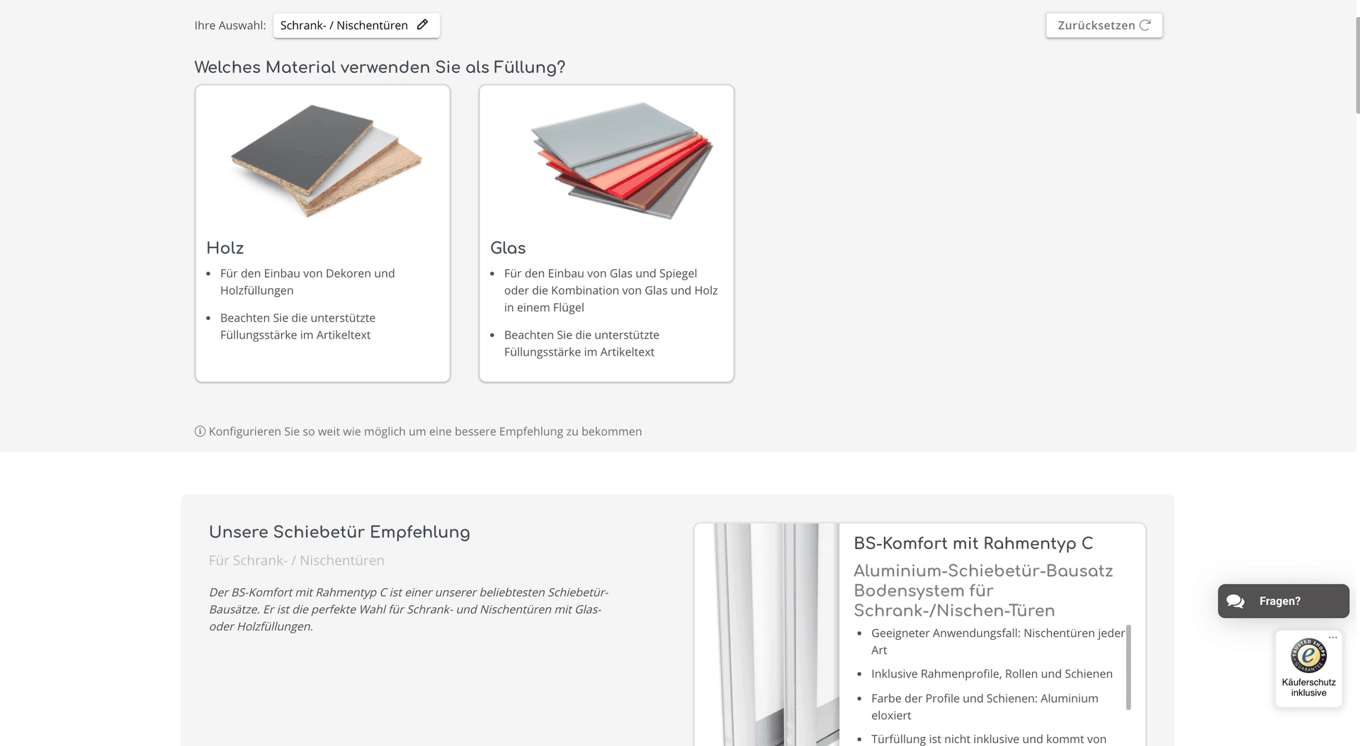 Basierend auf Ihren Angaben empfehlen wir Ihnen immer einen besonders gut passenden Schiebetür-Bausatz. Je weiter Sie den Beratungsprozess abschlißen, desto besser wird natürlich auch unsere Empfehlung. Unterhalb des empfohlenen Produkts finden Sie darüber hinaus natürlich alle Schiebetür-Bausatz, die zu Ihrer Auswahl passen.