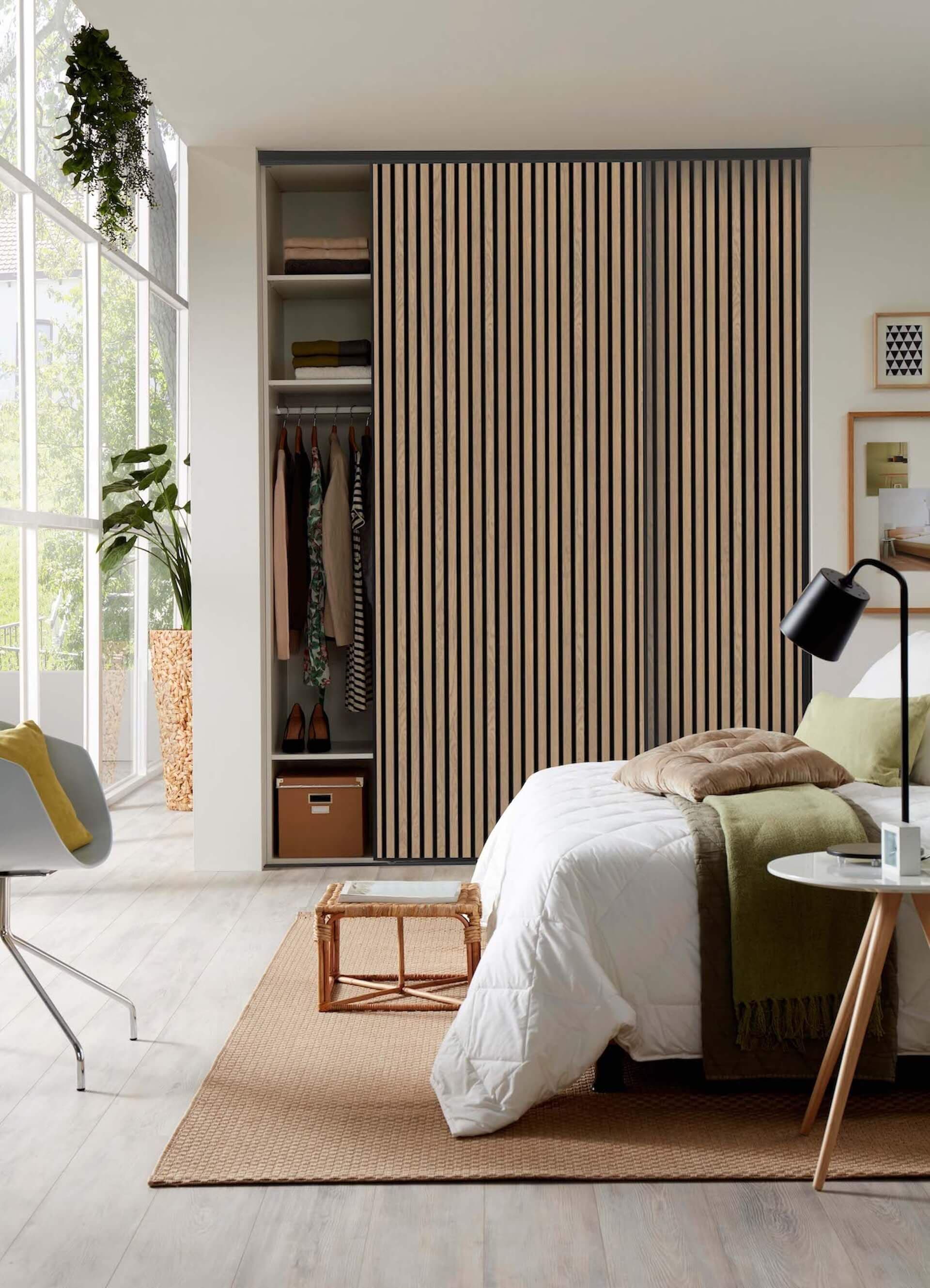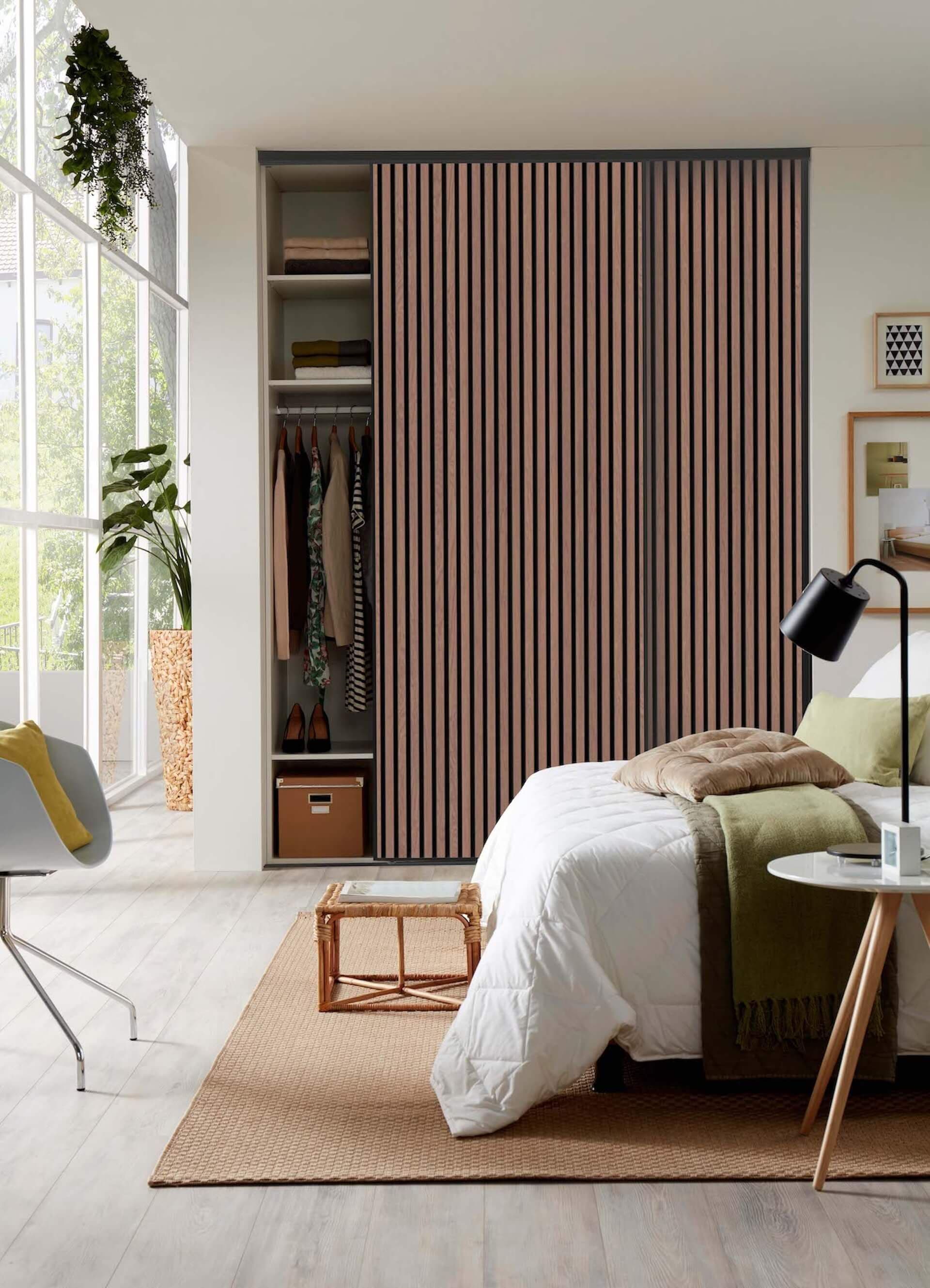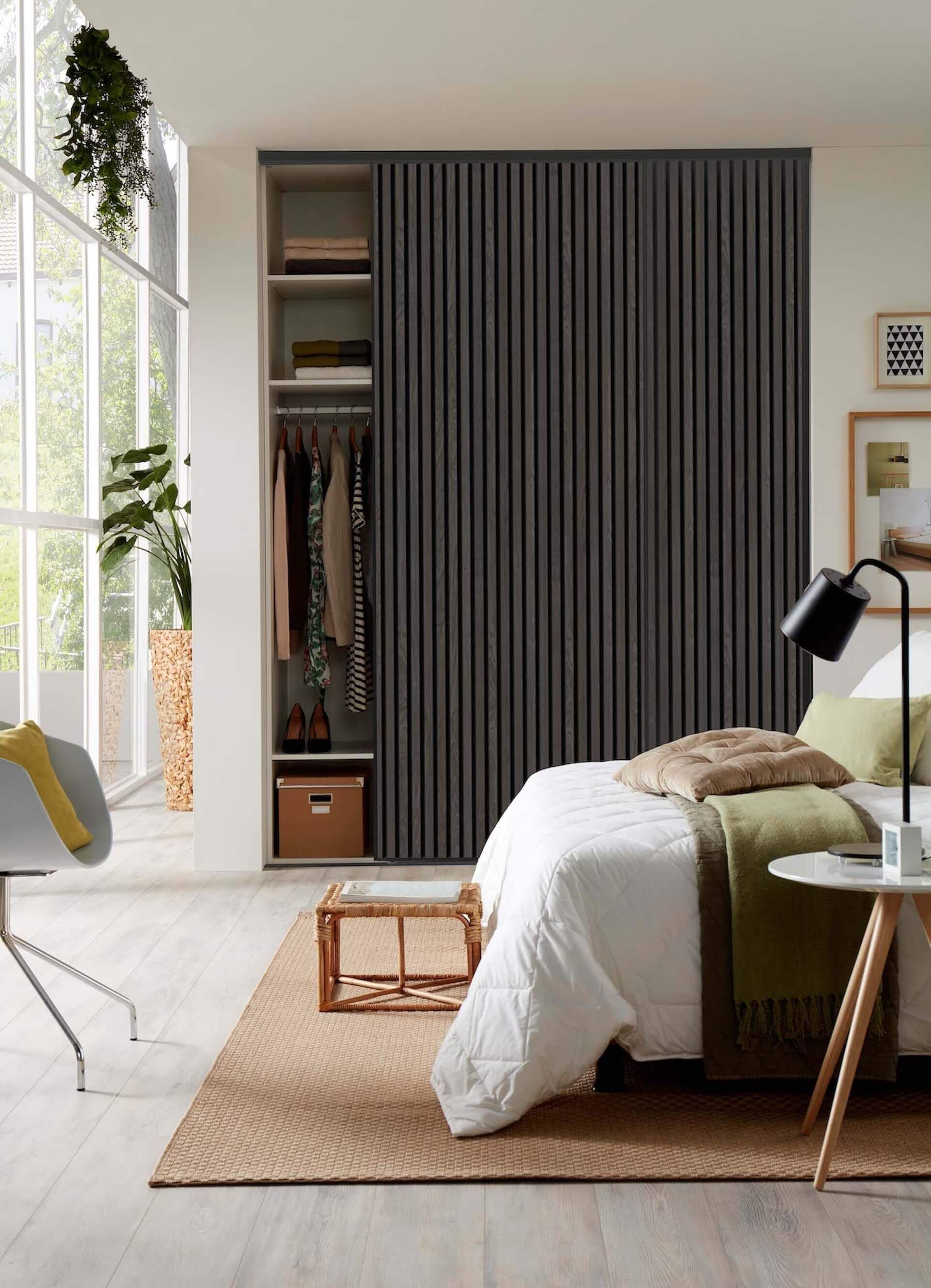 Lamellenschiebetüren auf Maß gefertigt. Wir bringen die trendigen Akustikpaneele zum Rollen. Unsere maßgefertigten Akustikpaneel-Schiebetüren verbinden stilvolles Design mit effektiver Schalldämmung. Wähle aus 6 eleganten Farben – eingefasst in einen edlen, umlaufenden Aluminiumrahmen in Schwarz mit passenden Boden- und Deckenschienen für einen modernen Look.
