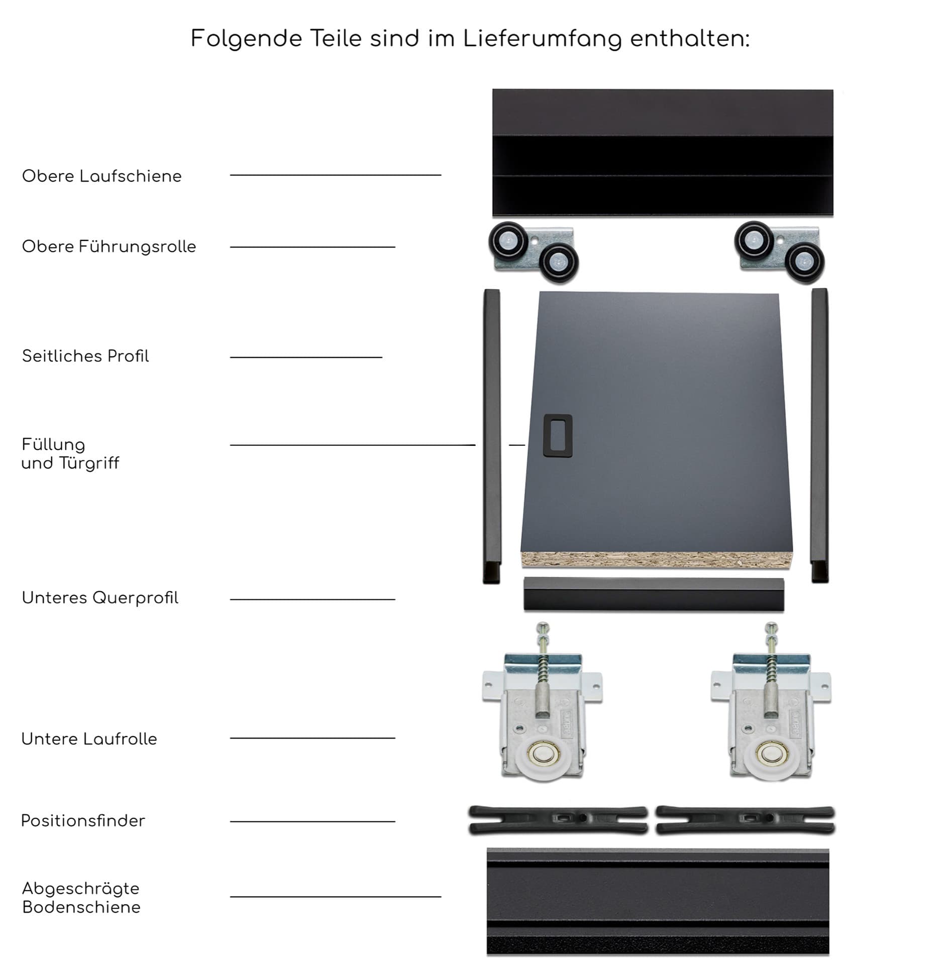 Inkl. Rollen, Schienen und Profile in Schwarz